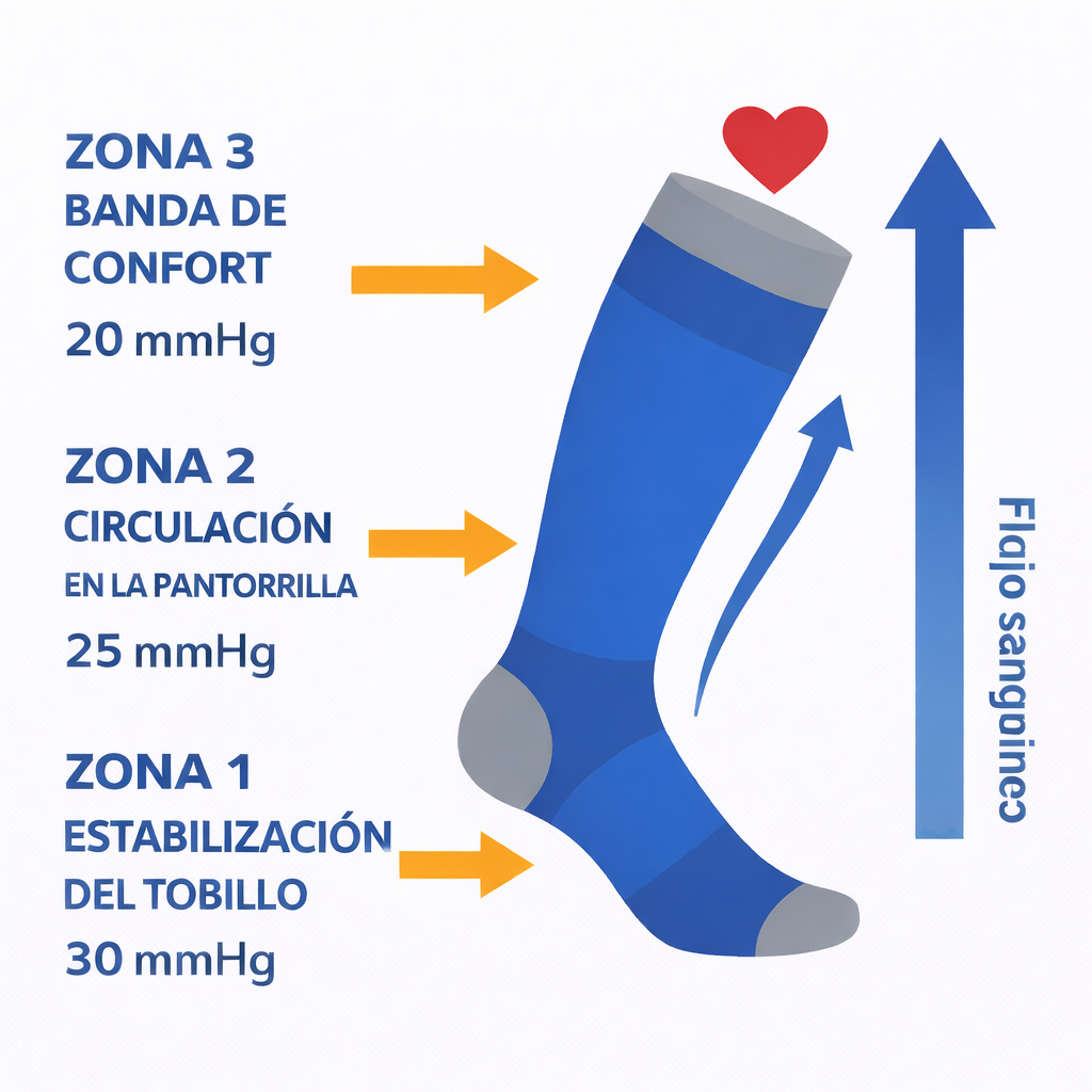 A diferencia de los calcetines comunes que ofrecen un soporte mínimo, el sistema de compresión gradual de 3 zonas de CircuLife está diseñado para brindar apoyo específico donde más se necesita: